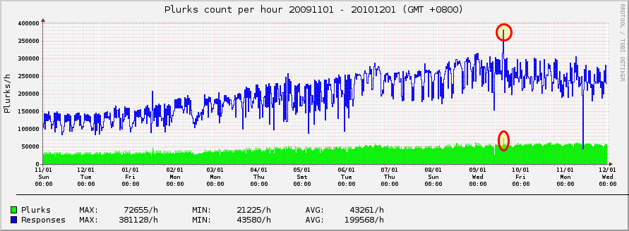 那時間區段之中正好經歷2009年八月台灣莫拉客風災對Plurk所產生的一個明顯高峰,但是之後因為非死不可挾開心農場大舉入侵台灣而造成Plurk的流量成長趨緩。